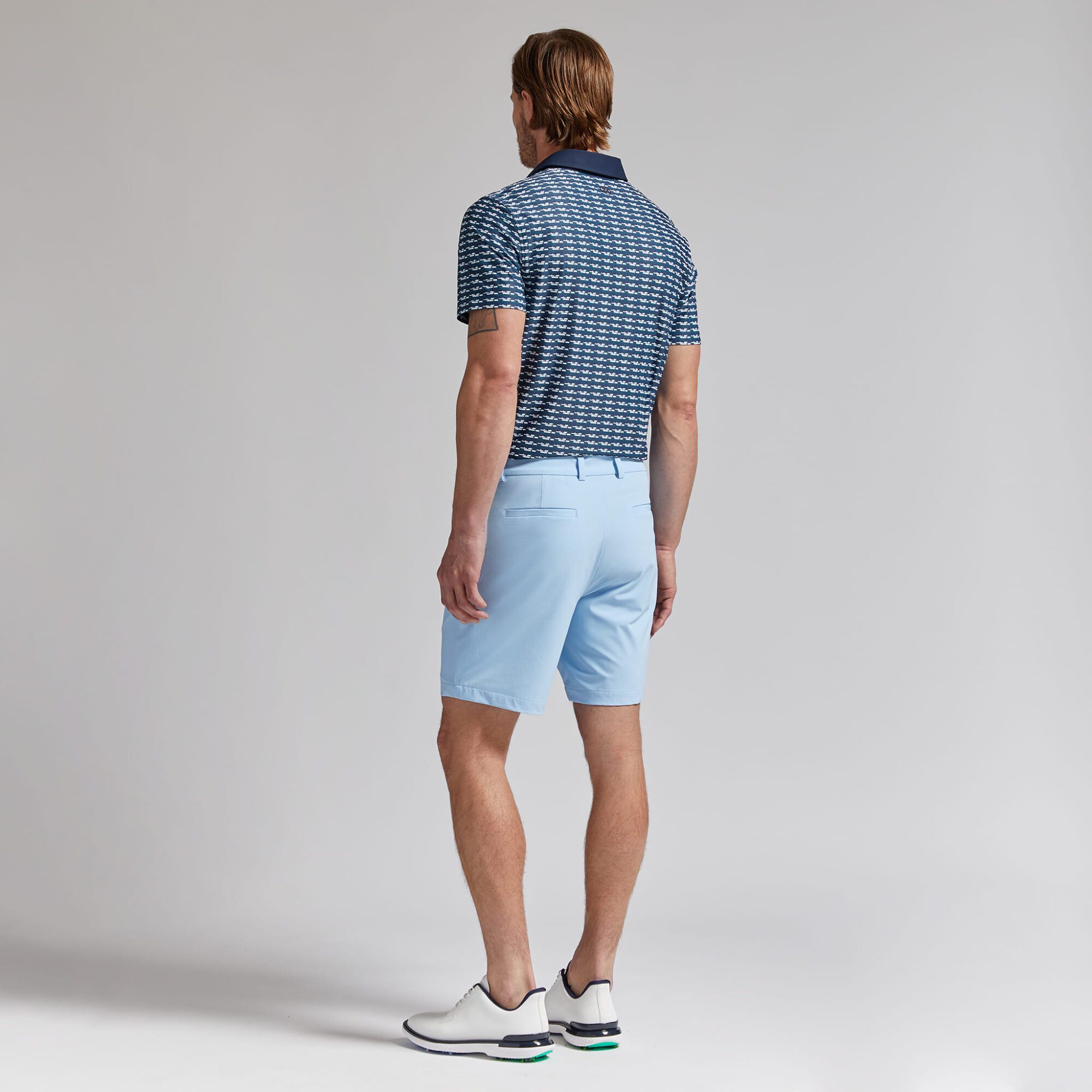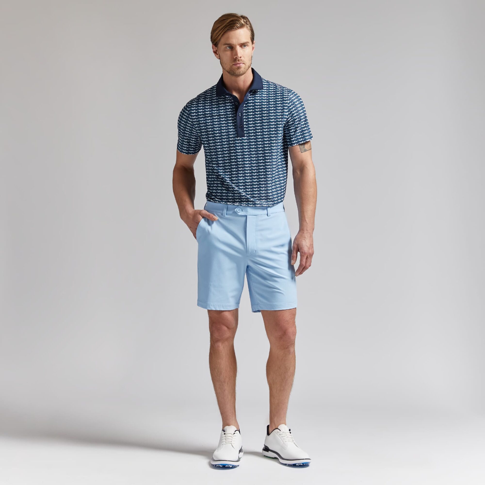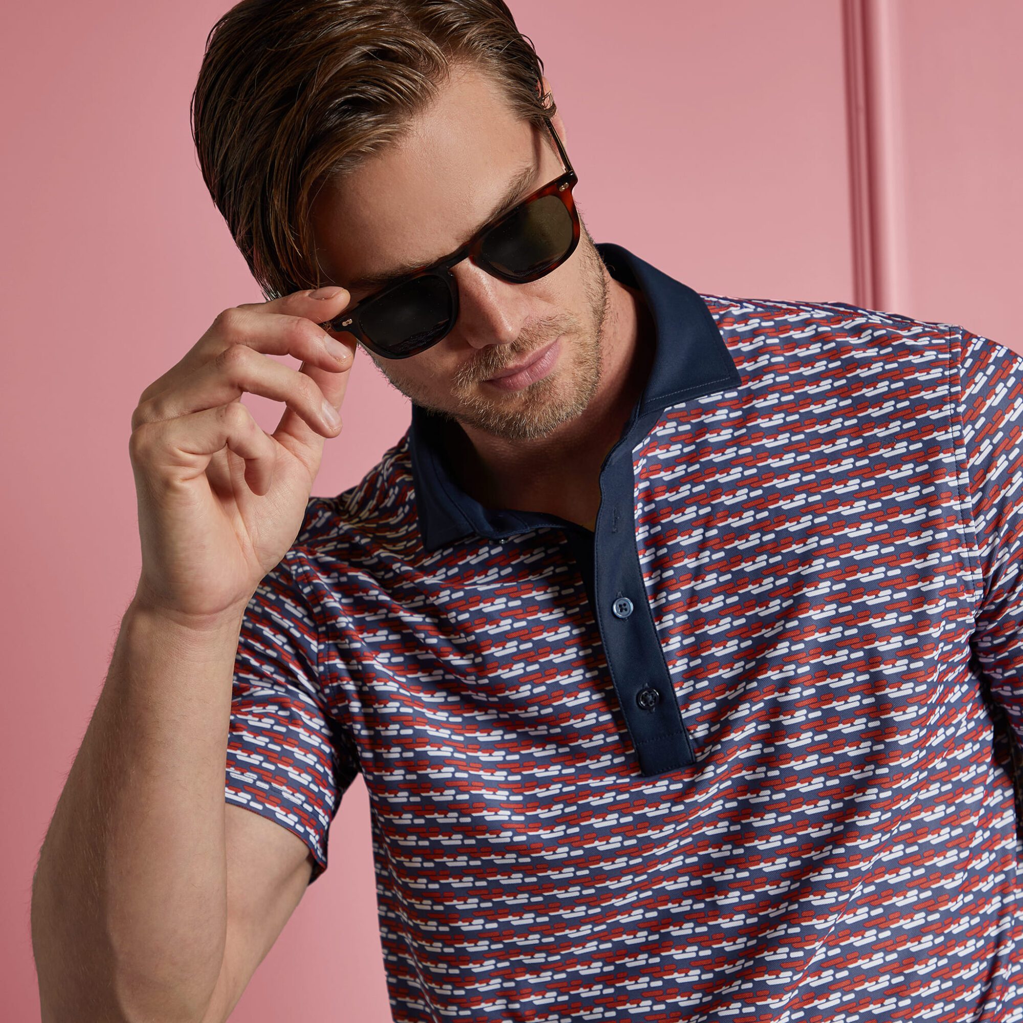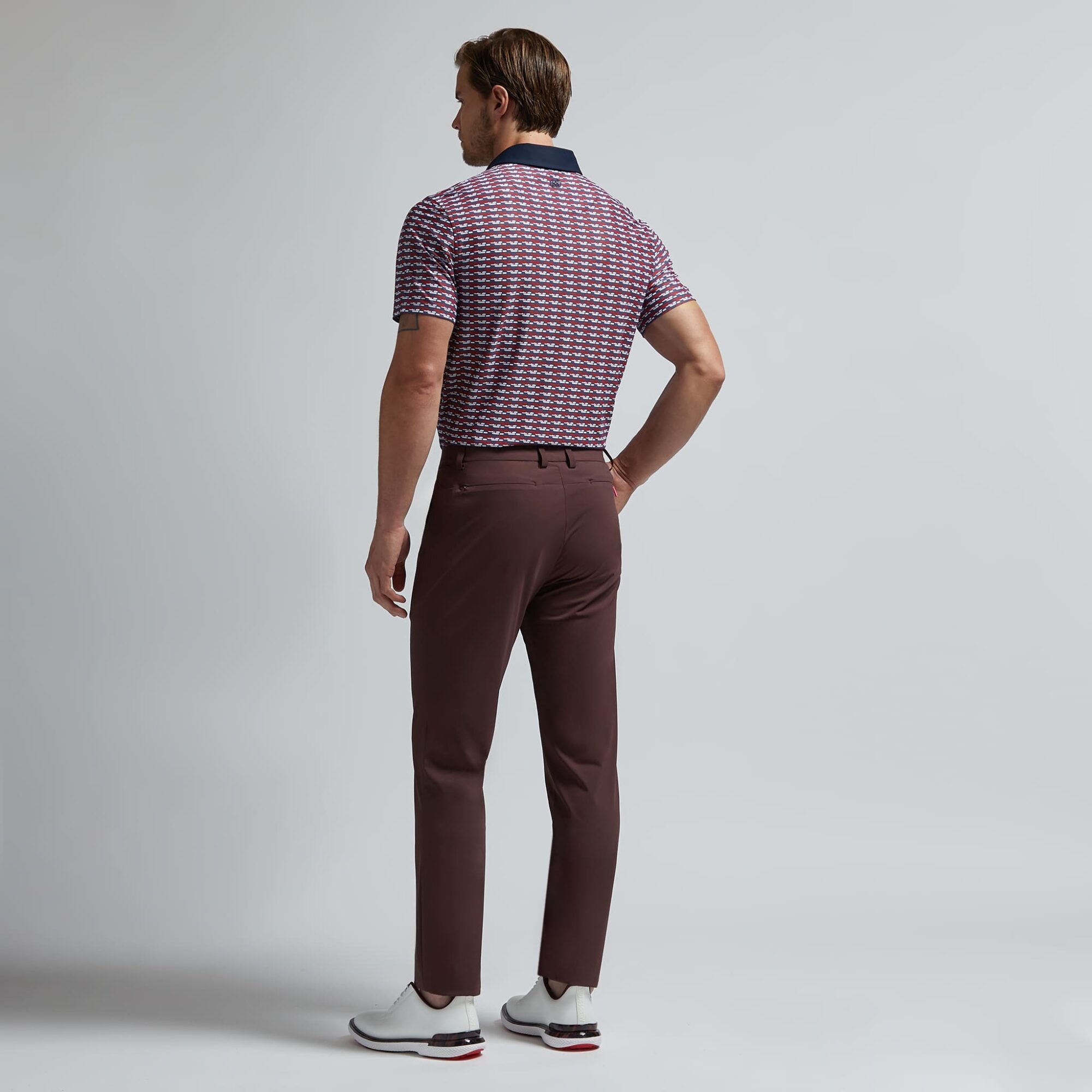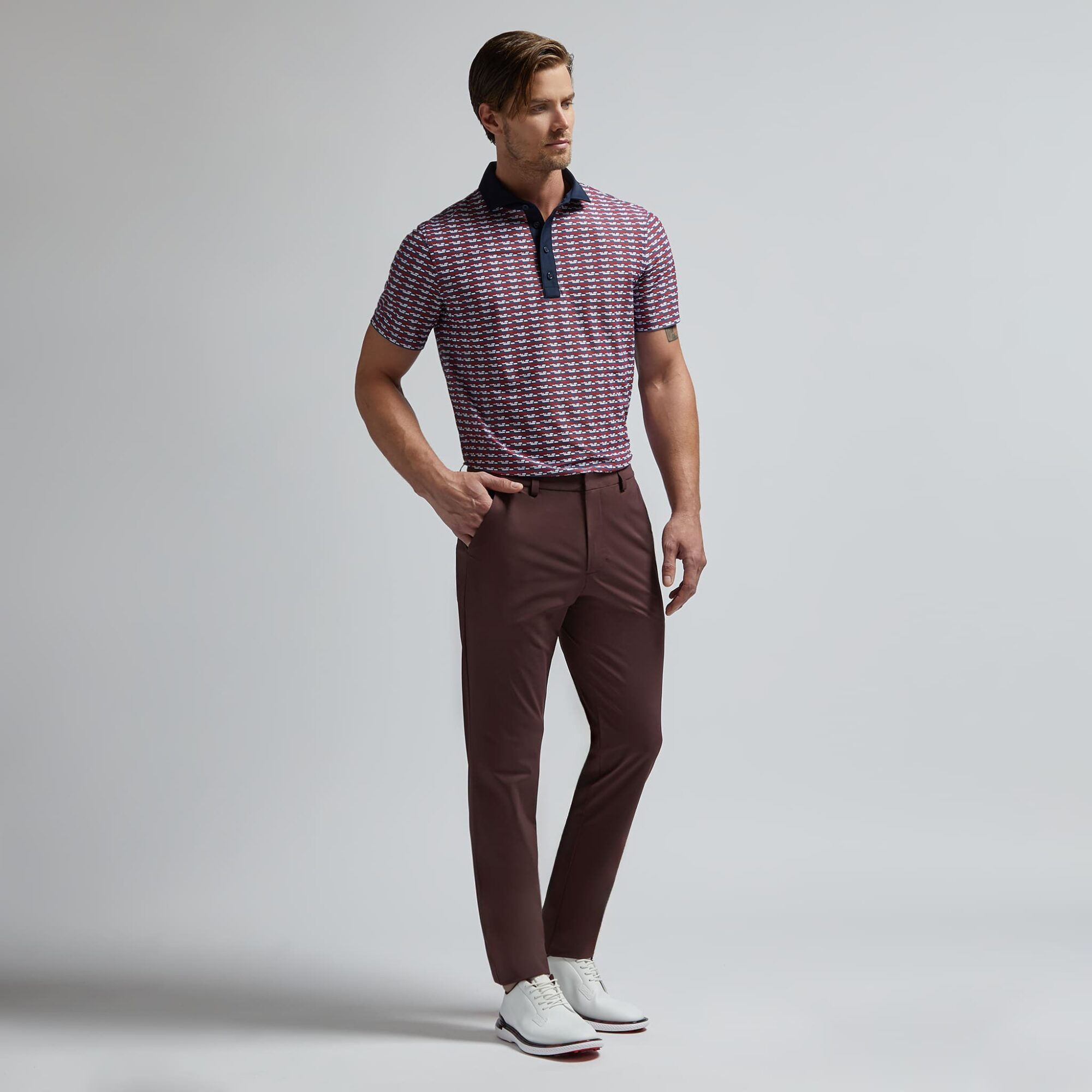 covered in our brick stripe print, this tech piqué polo is the ultimate everyday essential for days at the clubhouse, the course, and in between. made of breathable tech piqué fabric with moisture wicking and antimicrobial properties, plus unbeatable 4-way stretch, it’s a must-have for any golfer’s closet. tuck into a pair of our tour 5 pocket pants for an effortless look on the greens.