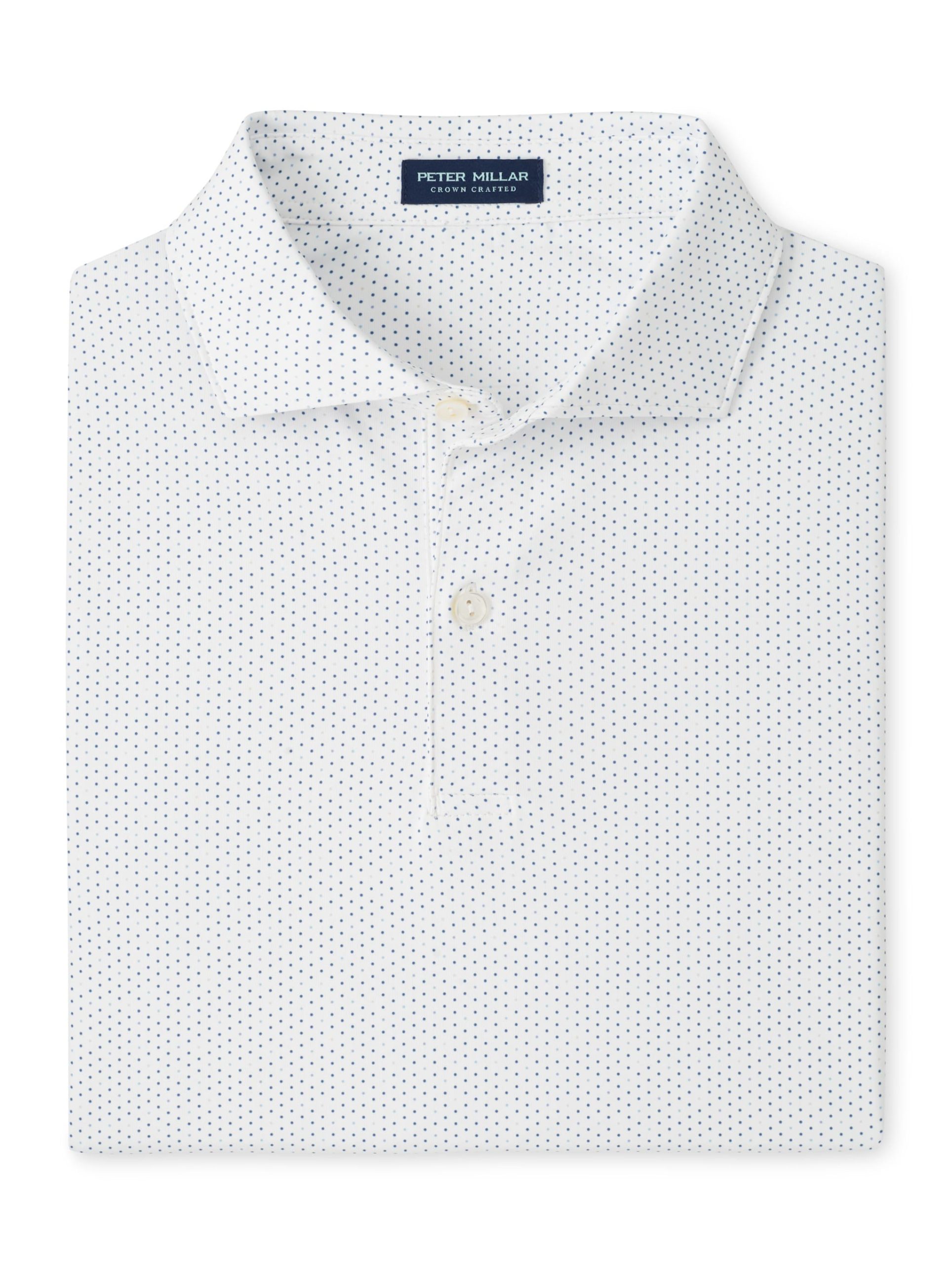 With clean style and exceptional comfort, our Crown Crafted jersey polos bring a soft, plush feel with wicking, four-way stretch, easy-care and UPF 50+ sun protection. This shirt features a custom-designed geometric dot print for added style. Finished with a spread collar and detailed with mother-of-pearl buttons.